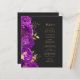 Cet élégant menu mariage moderne comprend une bordure de fleurs violettes et de feuilles de faux feuille d'or. Customisez le texte italique de couleur or sur un arrière - plan noir en ardoise foncée. L'arrière du menu est en ardoise noire.