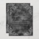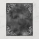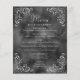 Cet élégant menu mariage d'inspiration vintage présente le texte en écriture gris argenté pâle et les polices serif, encadré par un motif de feuillage argenté vintage en quatre coins sur un arrière - plan d'aquarelle noir. Le cadre et l'arrière - plan d'aquarelle sont répétés au verso.