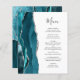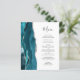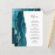 Le bord gauche de cet élégant menu mariage moderne comporte une bordure turquoise d'aquarelle bleue ornée d'une parties scintillant en faux argent. Le texte personnalisable combine un script d'écriture manuscrite gris charbon et des polices de cuivre sur un arrière - plan blanc. L'envers présente un design turquoise et argenté assorti.
