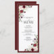 Un décor de réception parfait avec ce menu branché de 4"x 9", bouquet de fleurs bordeaux et roses pâles et verdure botanique, bordé d'un rouge bordeaux et riche. Personnalisez vos détails accentués par une belle calligraphie à la main moderne. Parfait pour, mais pas limité à, ce mariage de jardin et de jardin. Fait partie d'un ensemble correspondant. Voir la collection complète ici : https://www.zazzle.com/collections/plum_purple_floral_watercolor_calligraphy-119555439716895357 Contacter le concepteur pour les produits correspondants. Copyright Invitations élégants, tous droits réservés.