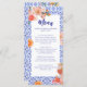 Élevez votre douche nuptiale avec cette carte de menu d'inspiration méditerranéenne, avec des motifs en tuiles bleues complexes et des accents d'agrumes oranges vibrants. Parfait pour une célébration à thème italien, cet élégant design saisit le charme de la côte amalfitaine avec son mélange de motifs méditerranéens classiques et de couleurs chaleureuses et accueillantes. Imprimée sur un carton de haute qualité, cette carte de menu personnalisable présente magnifiquement vos choix de nourriture et de boissons, ajoutant une touche sophistiquée à votre paysage de table. Que ce soit pour une fête toscane, des fruits de mer côtiers ou des plats de pâtes classiques, cette carte complète l'ambiance d'un événement chic baisé au soleil.