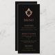 Un menu élégant à l'air vintage, à conseiller pour une mariage aux couleurs mariage de noir et rose. Au-dessus du texte, il y a un monogramme dans une vintage crête rose en or. Le titre "Menu" et les sous-titres sont écrits en casquette. Tout le texte peut être personnalisé et a une couleur rose semblable à la crête d'or rose. L'arrière - plan est noir. Sur le dos, il y a le même monogramme dans la crête. Le monogramme est formé par les deux initiales séparées par une fine ligne. La crête florale vintage est issue d'une vieille reliure de couverture, du livre "Rust, Smut Mildew & Mold", de 1870, maintenant dans le domaine public.