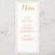 Un design d'inspiration orange et verte, ce menu de réception de mariage est composé d'un bel arrière - plan blanc avec une police orange. Avec "Menu" en haut avec une police orange cursive, toutes vos informations sont imprimées en caractères orange lisibles sur un arrière - plan blanc. Customisez comme vous le souhaitez.