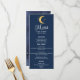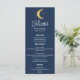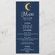 Présentant le menu mariage de nuit étoilé Crescent Moon, l'ajout parfait à toute réception de mariage à thème céleste! Ce magnifique menu bleu marine présente une lune brillante et centenaire d'or entourée d'une collection d'étoiles d'or, ce qui en fait le complément parfait à tout thème mariage de nuit étoilé. Le menu affiche les noms du couple heureux, leur date de mariage et une délicieuse sélection d'entrées, d'entrées et de desserts qui séduira vos papilles. Tout le texte est dans une simple police de bloc blanc, sauf le mot MENU, qui est dans une élégante police de script inclinée cursive, attirant l'attention des invités sur le but principal de la carte. Au fond du menu, un arrière - plan bleu et or fascinant du ciel nocturne et des étoiles, ajoutant une touche supplémentaire de beauté céleste à ce menu déjà époustouflant. Cette carte est la taille parfaite à 5 x 7 pouces, ce qui la rend facile à lire pour tous les invités à la table. Dans l'ensemble, le menu mariage de nuit Starry Crescent Moon est le moyen idéal d'ajouter une touche supplémentaire de beauté céleste à votre réception de mariage et de vous assurer que vos invités profitent d'une expérience gastronomique inoubliable.
