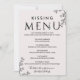 Ce menu de baiser à la typographie florale est parfait pour une réception de mariage élégante. Le design romantique présente un lettrage simple orné de fleurs, un bordement botanique et un arrière - plan subtil et blush.