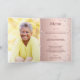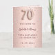Un fond dégradé or rose faux avec des diamants roses. Le nom est écrit avec un style de lettrage à la main de couleur or rose foncé moderne. Le numéro 70 est écrit avec une police de style ballon, script. Texte de bienvenue, photo, menu et un mot de remerciement au verso.