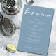 Cette carte de bar bleu poussiéreux respire la tranquillité pour un mariage côtier d'été en bord de mer. Personnalisez ce décor bleu gris clair avec une élégante typographie blanche minimaliste pour assortir votre jeu de couleurs nuptiales sereines.