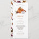 Menu de la dinde de Thanksgiving à la citrouille. Ce menu de dinde de Thanksgiving à la citrouille automnal élégant et mignon présente de belles citrouilles blanches et orange brûlé à l'aquarelle et des fleurs automnales avec un motif fantaisiste au verso.