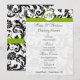 Cartes d'invitation de mariage à motifs damassés floraux noirs et blancs modernes avec garniture verte pomme. Parfait pour les thèmes de mariage Rococo Baroque, Renaissance médiévale, Art Déco Art Nouveau, Gatsby des années 20, Victorien ou Élégant Mariage à la Ferme.