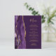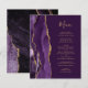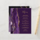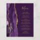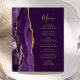 Le bord gauche de ce menu de mariage élégant et moderne présente une bordure d'agate aquarelle violette rehaussée de faux strass dorés. Le texte personnalisable combine une écriture manuscrite dorée et des polices copperplate sur un fond prune. Le verso présente un design assorti d'agate violette et dorée.