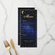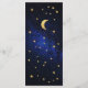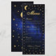 Ce menu de mariage céleste élégant est encadré d'étoiles et d'une lune en faux or sur fond bleu foncé représentant le ciel nocturne. Les noms, le titre "Menu" et les sous-titres sont écrits dans un élégant script calligraphique. Tous les textes peuvent être personnalisés et ont une couleur dorée similaire aux étoiles.