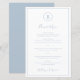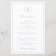 Simple menu mariage bleu poussiéreux avec votre monogramme dans un cercle en haut et vos options de menu entourées d'une fine bordure. L'en-tête et vos noms sont dans une police de script manuscrite élégante. La disposition classique et traditionnelle fait de ce menu un endroit idéal pour un mariage d'hiver formel. Ces menus mariages bon marché sont imprimés sur des feuilles de papier pour une option économique.