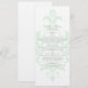 Simple avec élégance élégante décrit cette subtile carte de menu Mariage damassé avec un arrière - plan vert clair damassé fleuri. Ce menu classe est parfait pour un mariage traditionnel et peut être facilement customisé avec vos détails de mariage. Pour plus d'options de personnalisation, cliquez sur le bouton Customiser.