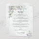 Ces menus de mariage magnifiques sont simples, élégants et stylés tout en étant économiques et abordables. Ils présentent un design chic bohème rustique avec un titre en calligraphie script, et des brins de feuilles d'eucalyptus peintes à la main à l'aquarelle et des fleurs de lavande sur un fond bleu acier pâle marbré. Le dos présente un bouquet champêtre de la même feuillure noué avec un ruban de satin blanc.