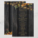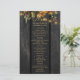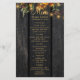 Modèle de menu de réception de mariage avec des éléments botaniques d'automne orange brûlé rustique et vert sur un fond en bois de grange brun foncé avec des guirlandes lumineuses. Idéal pour votre mariage élégant rustique de campagne extérieur arrière-cour jardin ou ferme en automne.