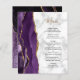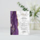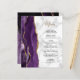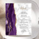 Le bord gauche de ce menu de mariage moderne élégant présente une bordure d'agate aquarelle violette rehaussée de paillettes dorées fausses. Le texte personnalisable combine une écriture manuscrite dorée avec une police en cuivre noir sur un fond en texture de marbre gris et blanc. Le verso présente un motif assorti d'agate violette et dorée.