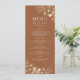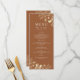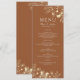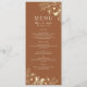 Simple, moderne, boho, menu de mariage en terre cuite botanique et floral avec dentelle de fleurs sauvages dorées élégantes et écriture manuscrite simple.