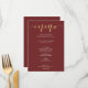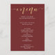 Ces cartes de menu typographiques bordeaux et or élégantes donneront le ton à une expérience culinaire raffinée. Le faux foil doré pour le mot "menu" se mariera à merveille avec de nombreuses couleurs de fond différentes si vous souhaitez personnaliser.