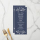 Menu de réception de mariage élégant et stylé avec des fleurs blanches sur fond bleu marine.