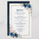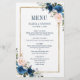 Un beau menu de mariage géométrique bohème moderne avec des fleurs magnifiques présente des graphiques floraux peints à la main à l'aquarelle / roses dans des tons riches de bleu marine et de rose blush avec un cadre doré. Veuillez me contacter pour toute aide à la personnalisation ou si vous avez besoin d'un autre produit avec ce design.