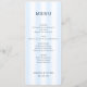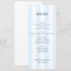 Ce menu de mariage élégant présente un design minimaliste avec des rayures verticales bleu clair et des tons pastel doux, créant une atmosphère calme et sophistiquée. La mise en page est structurée en sections distinctes pour une navigation facile, avec une typographie claire qui met l'accent sur la lisibilité et le style. Chaque titre de section est en majuscules sans empattements, tandis que les noms des plats sont présentés dans une police sérifée propre, assurant une cohérence tout au long. L'ambiance générale est celle d'un luxe discret, parfait pour une célébration de mariage raffinée.