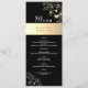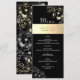 Menu de mariage noir et or vintage, botanique, bohème, chic, calligraphie, moderne, élégant avec dentelle florale dorée.