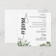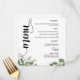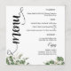 Apportez une touche de charme sophistiqué à votre réception avec ce menu de mariage élégant et verdoyant. Conçu en forme ronde avec une écriture fantaisiste et un feuillage luxuriant à l'aquarelle, il s'adapte parfaitement à chaque assiette. Un choix parfait pour les mariages en plein air, boho ou de jardin.