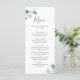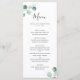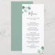 Menu de mariage élégant avec un design simple mettant en vedette une verdure d'eucalyptus peinte à l'aquarelle dans le coin supérieur gauche et le coin inférieur droit. Le verso est une teinte assortie de vert sauge moyen. Ce menu de mariage botanique rustique avec une touche moderne est parfait pour un mariage de printemps ou d'été.