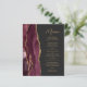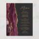 Le bord gauche de ce menu de mariage moderne élégant présente un design d'agate aquarelle bordeaux rehaussé de fausse paillette dorée. Le texte personnalisable combine une écriture manuscrite dorée et des polices sans serif sur un fond sombre. Le motif agate bordeaux et or est répété au verso.