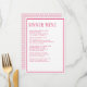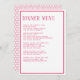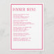 Cette carte est coordonnée avec la suite de faire-part de mariage et est pour les sélections de menu du dîner. Customisez facilement les choix de menu dans notre modèle simple. Vous pouvez personnaliser la couleur de la bordure, de la police et du motif couleur arrière - plan à l'aide des outils simples fournis. Montré en rose vif et riche. Style moderne, simple avec un serif, toutes les polices de caractères casquettes.
