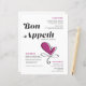 Ces dîners de style vintage de 8,5" x 11" mariages menus de feuilles de papier noir avec un titre stylisé, "Bon Appetit", en grandes lettres noires avec un accent de coeur magenta sur un arrière - plan d'albâtre. Le menu propose 2 entrées, 2 entrées et 2 desserts ainsi que les noms des couples mariages.
