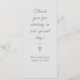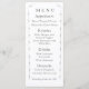 Le design présente le format de menu approprié pour une réception de mariage élégante ou formelle. Le texte s'affiche dans une belle bordure délicate. Reverse présente un message spécial de gratitude de la mariée et du marié dans une jolie police cursive juste au-dessus d'un délicat fleuron. Une simple croix argentée est photographiée au centre. Les noms des couples et la date du mariage sont affichés ci-dessous dans une version plus petite. L'arrière - plan avant est blanc tandis que l'inverse est une légère nuance d'argent. Également disponible en rose champagne. Très formel et élégant. Conçu pour coordonner avec la "Suite Mariage purement catholique".