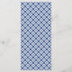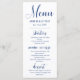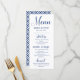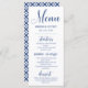 Menu mariage minimaliste en blanc avec texte calligraphie bleu marine et polices élégantes. Personnalisez avec vos noms et votre date de mariage. L'arrière est orné d'un motif classique carrelé aux couleurs assorties.