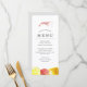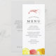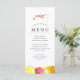 Menus de nourriture personnalisés sur le thème des crevettes pour votre prochaine fête d'ébullition de crevettes ou événement de fruits de mer. Il présente une illustration de style aquarelle d'une crevette. En dessous, il y a des espaces pour les informations de votre menu d'événement unique.