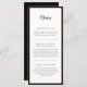 Modern Elegance Le menu Mariage noir et blanc présente les noms des couples dans la belle calligraphie et la date dans une police serif traditionnelle sur un côté. Au fond, le menu de la réception est entouré d'une bordure noire minimale. Personnalisez les descriptions de menu de votre réception de mariage pour tenter vos invités avec le repas à venir. Ce design est disponible dans une variété de formats et de produits d'événements mariages qui l'accompagnent.