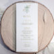Menus de baptême : complétez votre célébration avec ce menu de baptême élégant orné d'une croix aquarelle peinte à la main, rehaussée d'un nœud vert sauge doux et de délicates vignes botaniques dorées. Le design chrétien gracieux est associé à une écriture calligraphique dorée raffinée, créant un look intemporel et coordonné pour vos tables de réception.