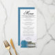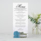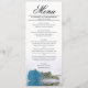 Ce beau menu ajoutera un peu de style à votre réception de mariage. Il présente un design magnifique et romantique avec un rose bleu ciel, turquoise ou azur sur son côté, réfléchissant dans un bassin d'eau avec vagues et ondulations. Il y a de l'espace pour les noms du couple et la date du mariage, et le texte est entièrement personnalisable.