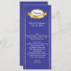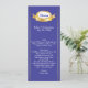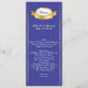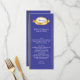 Longue et fine carte de table mariage faite dans un bleu élégant, avec des rayures de ton or sur le côté et des graphiques d'un ton or et plaque décorative blanche, au sommet. Personnalisez tout le texte pour convenir à votre menu de réception de mariage. Jolie addition à votre réception de mariage.