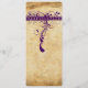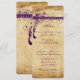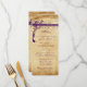 Menu de mariage vintage de la Renaissance médiévale rustique avec éléments pourpres sur un design de papier en détresse. Ferme rustique de campagne, arrière-cour de grange, beige caramel et pourpre