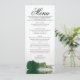 Ce beau menu ajoutera un peu de style à votre réception de mariage. Il présente un design magnifique et romantique avec un seul rose couleur vert émeraude posé sur son côté, se reflétant dans un bassin d'eau avec vagues et ondulations. Il y a de l'espace pour les noms du couple et la date du mariage, et le texte est entièrement personnalisable.