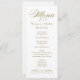 Les cartes de menu élégantes et formelles du dîner mariage disposent d'un script élégant et de détails de défilement avec un design d'inspiration vintage. Couleurs blanches et or ancien. Personnalisez le monogramme personnalisé avec les noms de mariée et de mariée, la date de l'événement et les détails du menu.