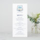 Cette élégante carte de menu mariage côtier comporte une crête monogramme de plage aquarelle avec les initiales de la mariée et du marié, et la date mariage sur la bannière de la crête.