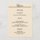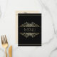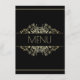 Un élégant menu Mariage noir et or conçu avec des accents dorés sur un arrière - plan noir. Le texte avant comprend : MENU. Le texte inverse inclut les détails du menu complet sur un arrière - plan de couleur lin correspondant, avec une bordure noire. Pour personnaliser, insérez simplement votre texte dans notre modèle facile, en remplaçant l'exemple de texte.