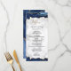 Ce menu mariage moderne et élégant présente des bordures de haut et de bas de l'agate bleu marine d'aquarelle ornée d'une fausse parties scintillant dorée. Le texte apparaît dans un élégant script d'écriture manuscrite de couleur or et des polices en italique et en cuivre noir sur un arrière - plan en marbre gris et blanc. La conception de l'agate est répétée à l'envers.
