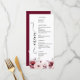 This elegant monogram floral wedding menu card is double-sided. One side features watercolor burgundy and blush flowers on a clean white background, and the other side features bouquet flowers, names, and date on a burgundy background. It's perfect for elegant, romantic, and classic weddings, anniversaries, and rehearsal dinners.