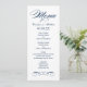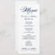 Les cartes de menu élégantes et formelles du dîner mariage disposent d'un script élégant et de détails de défilement avec un design d'inspiration vintage. Couleurs bleu marine et blanc. Personnalisez le monogramme personnalisé avec les noms de mariée et de mariée, la date de l'événement et les détails du menu. Vous pouvez modifier la couleur du texte et de l'arrière - plan pour la coordonner avec votre jeu de couleurs mariage.