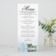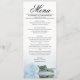 Ce beau menu ajoutera un peu de style à votre réception de mariage. Il présente un design magnifique et romantique avec un seul rose bleu clair et poussiéreux posé sur son côté, se reflétant dans un bassin d'eau avec vagues et ondulations. Il y a de l'espace pour les noms du couple et la date du mariage, et le texte est entièrement personnalisable.