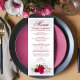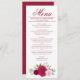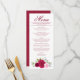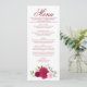 Ce beau menu ajoutera un peu de style à votre réception de mariage. Il présente un beau design boho chic floral avec un ensemble de roses d'aquarelle peints à la main dans les tons rose chaud, magenta et rougissant, ainsi que des sprigs de feuilles d'eucalyptus et de verdure du jardin. Il y a de l'espace pour les noms du couple et la date du mariage, et le texte est entièrement personnalisable.