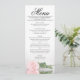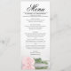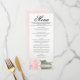 Ce beau menu ajoutera un peu de style à votre réception de mariage. Il présente un design magnifique et romantique avec un seul rose rose pâle et rose pâle allongé sur son côté, se reflétant dans un bassin d'eau avec vagues et ondulations. Il y a de l'espace pour les noms du couple et la date du mariage, et le texte est entièrement personnalisable.