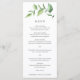 Menu mariage rustique au design simple avec une aquarelle verte peinte avec de grands feuilles, sur un arrière - plan blanc. Un design botanique élégant qui conviendra à un mariage d'été.